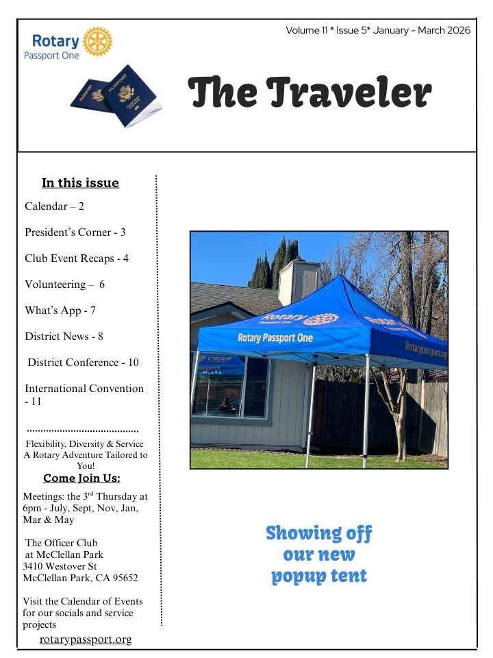 Presidents Message 1-20![]() It's a new year AND a new decade and new opportunities to connect Passport One with Rotary! The board has been working hard to create a calendar that will inspire you to have fun while also giving back. Our first meeting (Jan 9) finds us touring Rise Against Hunger's new facility as well as packaging weekend backpacks of food for the students at Mustard Seed. We've also been invited by the W. Sac Centennial Club to help with their service project of picking up Wreaths placed for our veterans at a cemetery in Dixon. We've also got a trivia night planned for January 14th and Christie will be getting details out shortly. Our two biggest events coming up, where we will need all hands on deck will be the Roseville Club's Taco Throwdown on April 18th and Wine'd Up for Youth on May 16th. Each of these events will help youth within our communities as well as Rotary youth programs. Please mark you calendars so you can make a difference in these kids' lives. Thank you for being a part of Passport One!